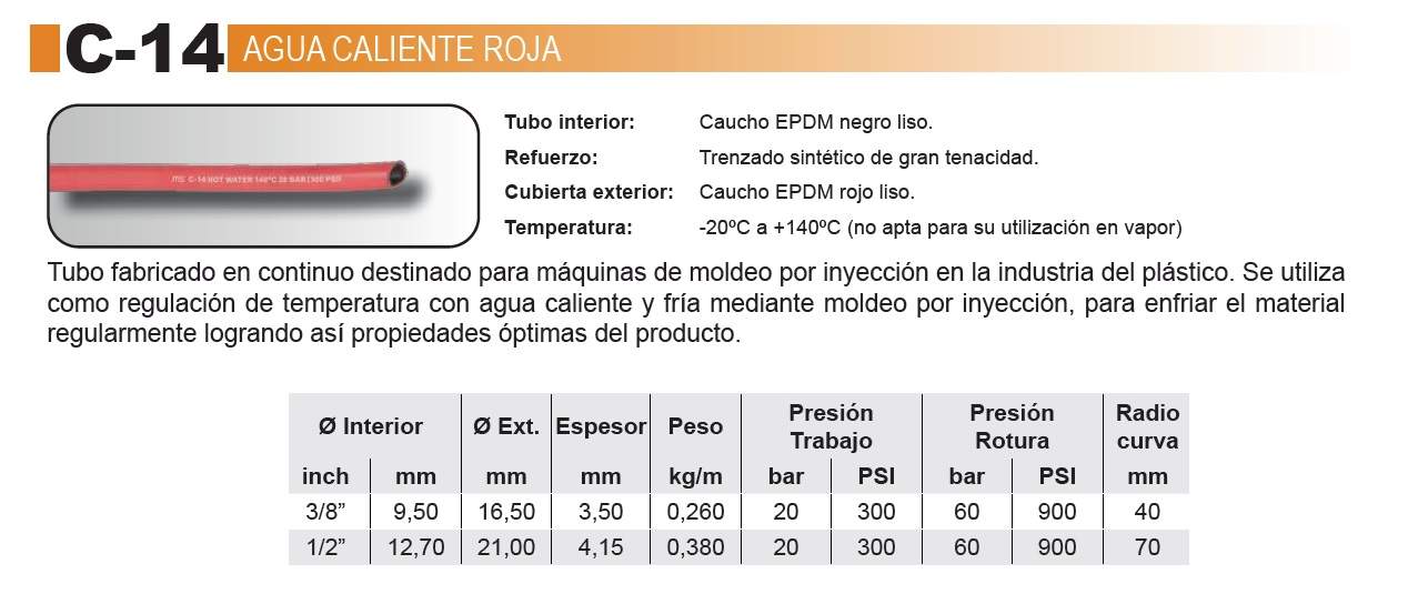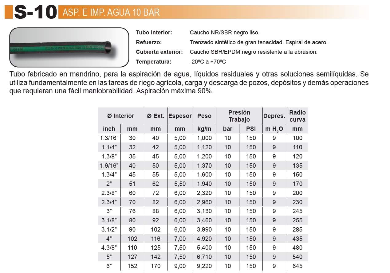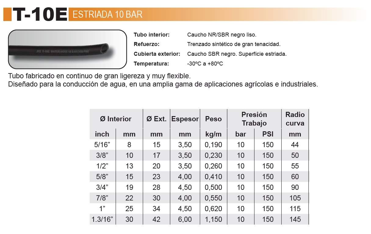 Las mangueras de goma para agua están diseñadas para aplicaciones industriales, agrícolas y de obra pública que requieren una conducción eficiente y segura de agua a distintas presiones y temperaturas. Fabricadas con compuestos de caucho sintético o natural y reforzadas con trenzados textiles o espirales, estas mangueras ofrecen una excelente flexibilidad, resistencia al desgaste, a la intemperie y al envejecimiento por ozono o rayos UV.